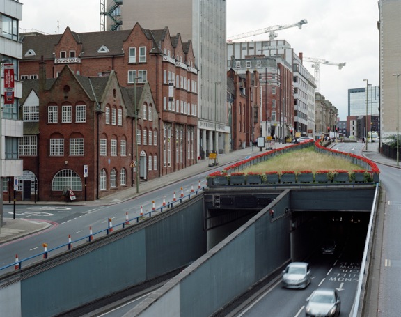 Avec leurs photographies, on aborde autrement ce qui se définit comme un concept élastique et protéiforme : le paysage. Favret et Manez créent des paysages dans le paysage. Le paysage urbain est vaste, tentaculaire. Il englobe les périphéries, les lisières et les zones industrielles. Les no man’s lands, les friches, les abords, tout ce qui prendrait en compte les entre-deux : routes, quartiers, ronds-points, croisements, autoroutes, pénétrantes, chantiers, zones de contournements, centres commerciaux, végétaux, points d’eau, rocades, distances fractionnées mi-figue, mi-raisin, mi-fugue, mi-raison.