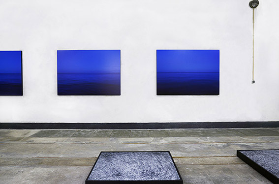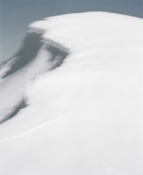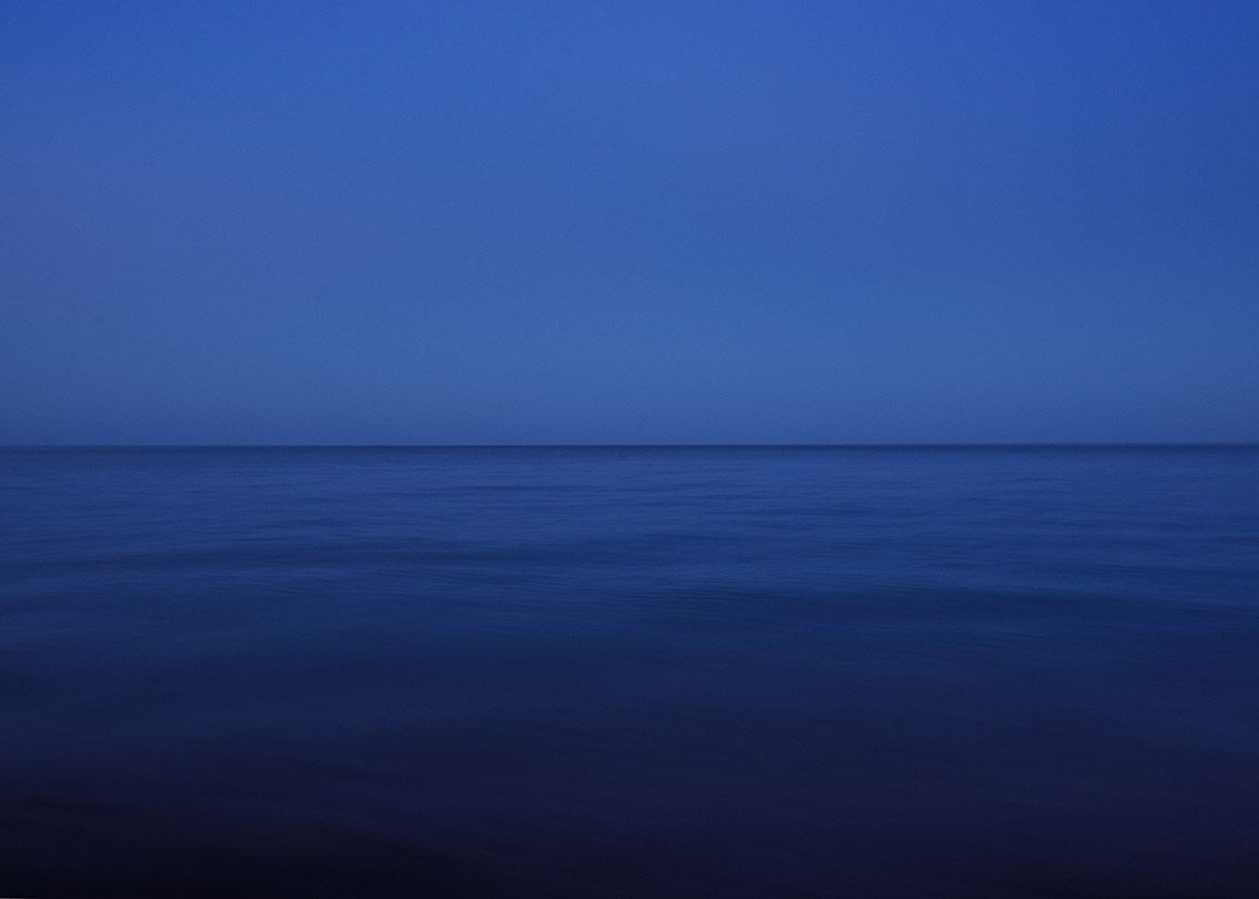 On dirait que le photographe regarde le paysage comme un landartiste mais sans intervention directe et sans appropriation. Il ne le touche pas, il est dedans à chercher les repères de l’avancée. Il déambule comme tombe la neige. Il se laisse toucher par un ensemble tangible de formes et de matières, avec une perception aiguë des espaces dans l’espace. Il est dedans à devancer les possibles de l’expérience de la marche et du visible. A se prêter non pas à une initiation méditative, mais plutôt à une réinitialisation des paramètres de l’approche sensible et palpable d’un territoire sans frontière. Il sort de la fascination et de son emprise. No limit à ce que voudrait embrasser l’œil. La série Zéro, l’infinien témoigne. L’horizon nous échappe et nous assistons impuissants à un naufrage. Surnaturels sont les bleus de l’océan quand ils se superposent et s’additionnent à force d’exister. Les lignes des formes qui se dessinent appartiennent bien au monde propre à l’artiste comme son corps appartient à la planète et au cosmos. C’est un peu de ce partage qu’il nous livre. Pas de lyrisme aux points de vue. Pas d’emphase aux sensations. Et cette forme hirsute d’aspect minéral sortie d’un nuage de mousse et de neige, est-ce la mollesse d’une montre qui perd ses aiguilles