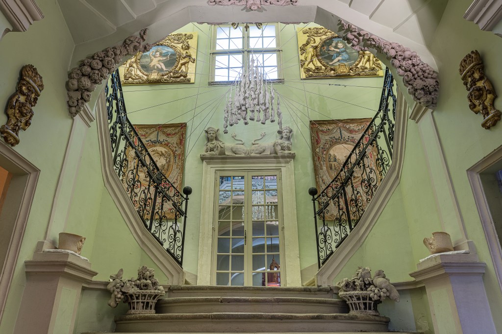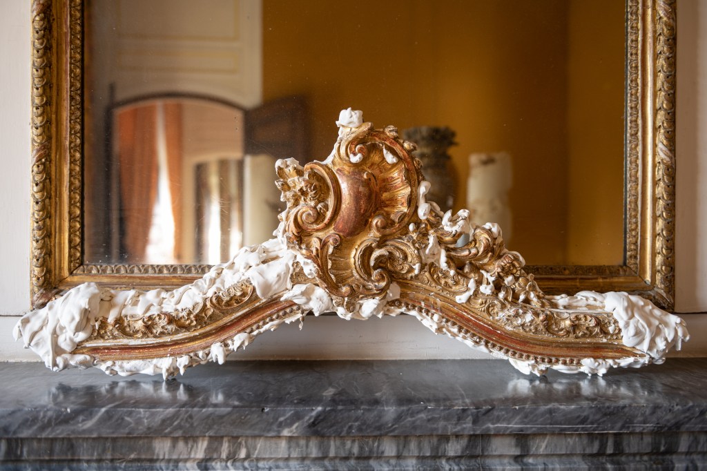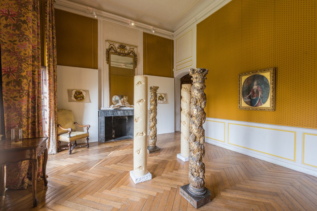 L’artiste propose d’élaborer des jeux de passage avec les éléments du bâti du Musée. Elle s’appuie également sur l’architecture du lieu avec ses décors, travaille à partir des médaillons dans l’escalier, transfert d’ombres, jeu des installations avec la pente inclinée du toit, réponses aux moulures, aux fresques et aux bas-reliefs existants.